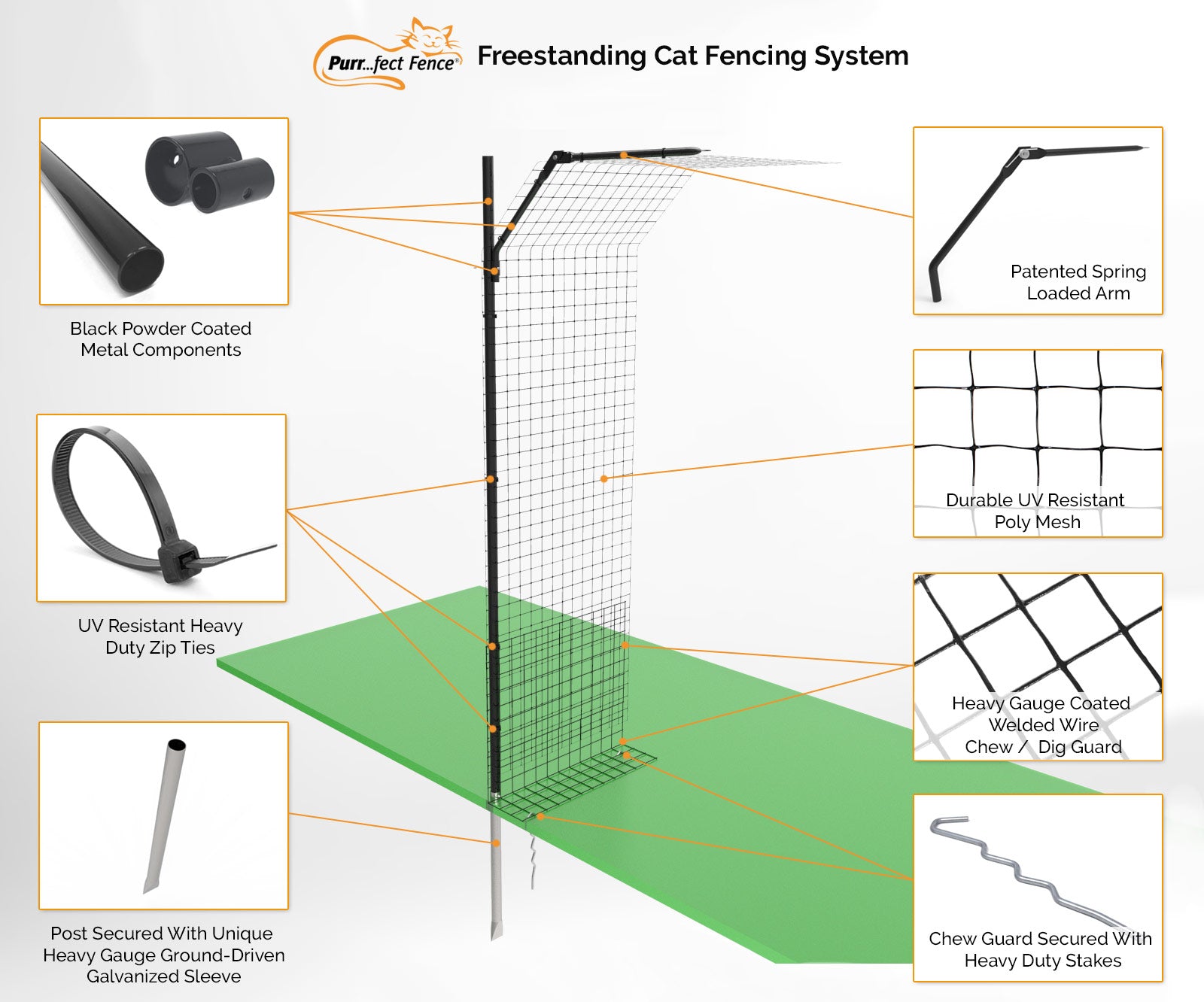Purr…fect Fence offers custom cat enclosures that can be installed free-standing or to modify an existing fence, and thus offers a complete outdoor cat enclosure system specifically designed for cats.