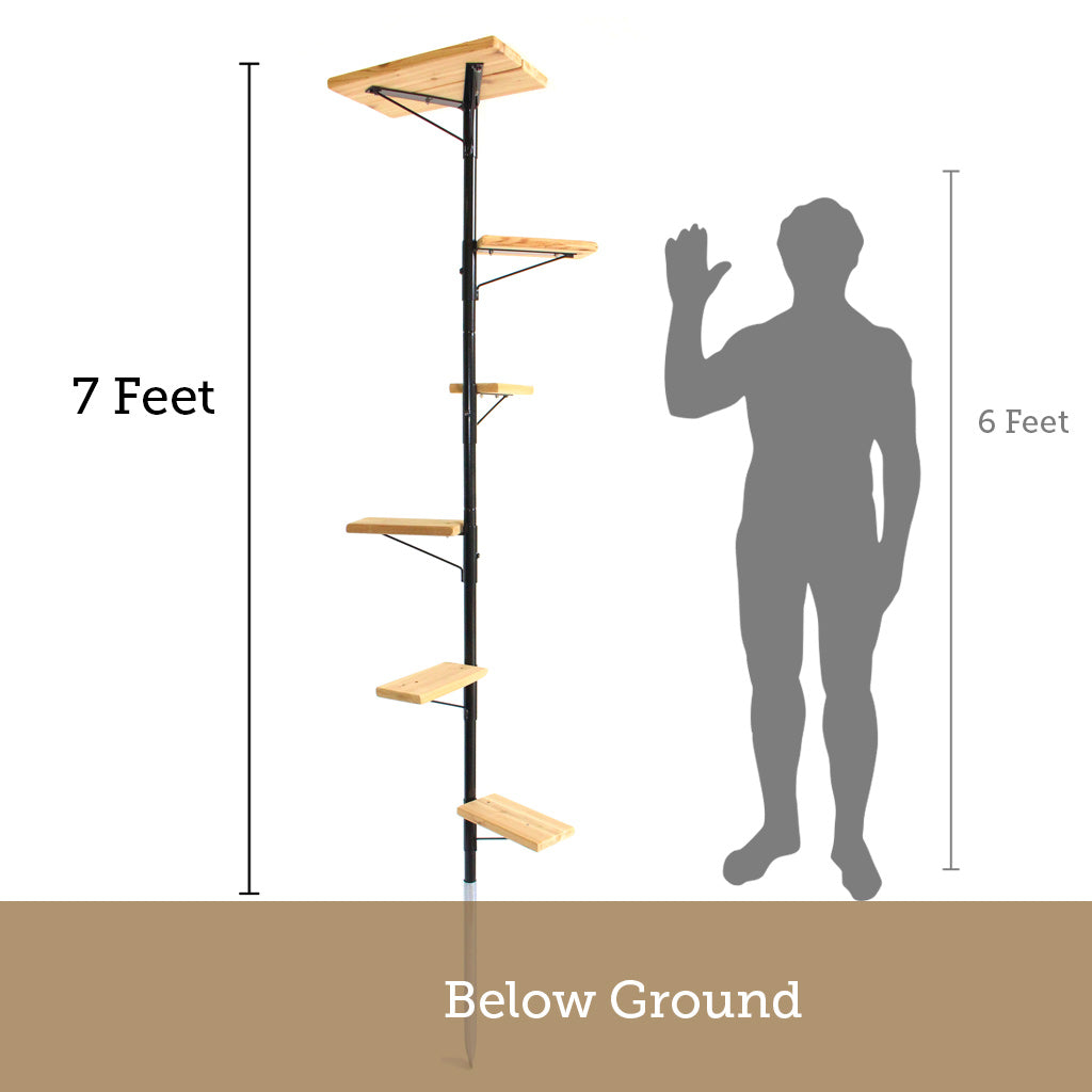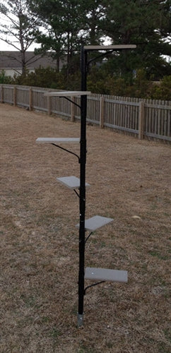 The Purrfect Perch cat tree framework is all powder coated galvanized steel and the large cat perch platform and stair treads are Western Red Cedar. The support post is set into the ground with a post anchoring ground sleeve (no digging required). The steps and platform positioning can be custom set to your needs and secured to the support post with stainless steel set screws (included). Custom heights are attainable with our cat tree by simply cutting the post to the desired height, or you can leave the post at its 7' height and simply set the steps and platform for the cat tower where desired.
